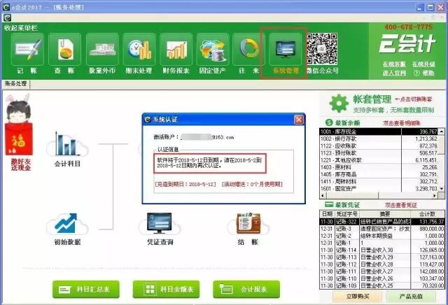 2、必需使用充值過的會員賬號再次激活軟件(重裝軟件前,登陸e會計軟件,進入賬套,點系統管理-系統認證,可以看到您充值的會員賬戶,可以拿筆記錄下來!),重裝軟件不需要再次充值,使用充值過的會員賬號和密碼激活軟件就可以。